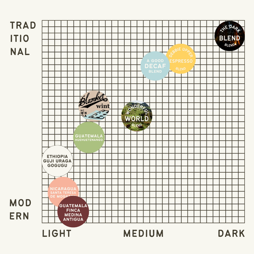 OR...meet in the middle with the crowdpleasers that are the "Guatemala Huehuetenango", or "Wonderful World Blend".