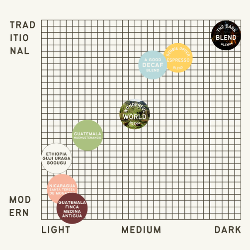 OR...meet in the middle with the crowdpleasers that are the "Guatemala Huehuetenango", or "Wonderful World Blend".