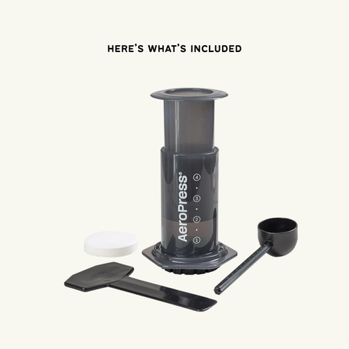- Included: Aeropress Coffee Maker, Coffee Scoop, Stir Spoon, Starter Pack of Filters
